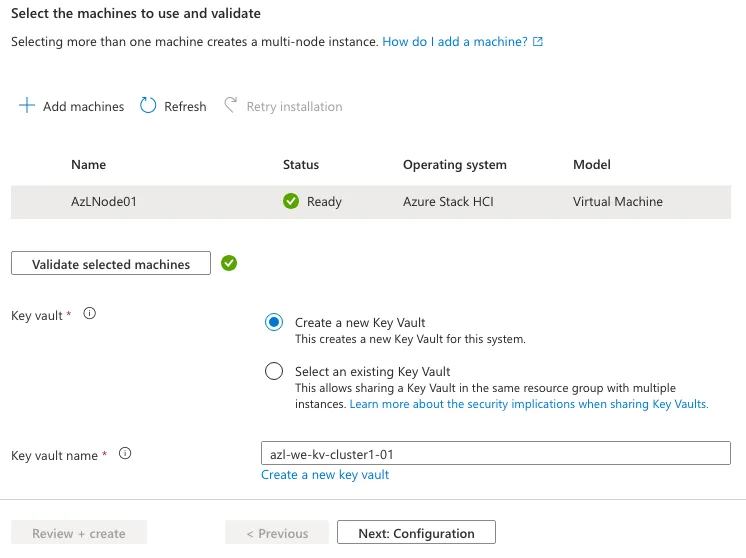 Since no Key Vault was available in the resource group at the time, I created a new one to support the identity and security requirements of the deployment. Once the node successfully passed all validation checks, I proceeded to the configuration phase to continue building out the cluster.