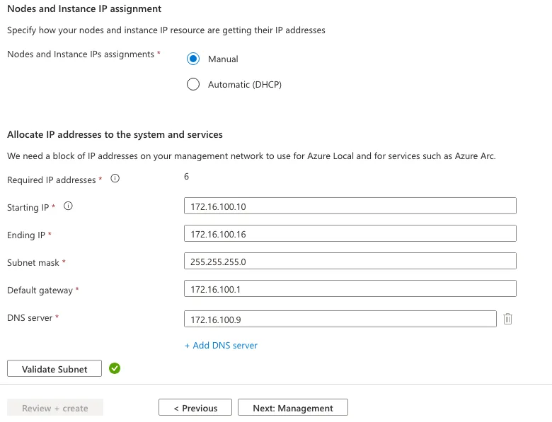 As part of the cluster configuration process, it is mandatory to allocate a contiguous set of at least six free IP addresses within the same subnet. These IPs will be automatically assigned by the system to various roles within the Azure Local cluster. Manual assignment of specific IPs to individual roles is not supported; instead, the platform dynamically maps each IP to its designated function based on internal logic.