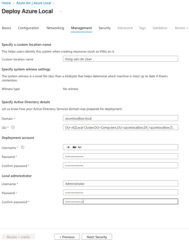 The deployment account you specify here should be the same account that was created during the Active Directory preparation steps. This account requires the appropriate permissions to join machines to the domain and manage objects within the designated OU. Providing these details ensures that the cluster can be correctly domain‑joined and that identity integration functions as expected.