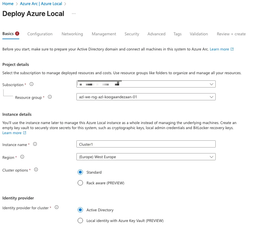 After initiating the cluster creation process, begin by selecting the appropriate subscription and resource group. It is important to ensure that all Azure Local–related resources—including the Azure Arc–enabled server object—reside within the same resource group. Keeping these components together simplifies management, improves visibility, and helps maintain a clean and consistent deployment structure.